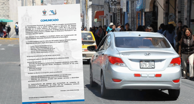 La Municipalidad Provincial de Arequipa decidió suspender la implementación del nuevo plaqueo vehicular en el Centro Histórico, prevista para el 6 de octubre. La medida continuará bajo la Ordenanza 927, mientras se prepara un plan gradual con campañas de información que garanticen la participación ciudadana y reduzcan la congestión vial.