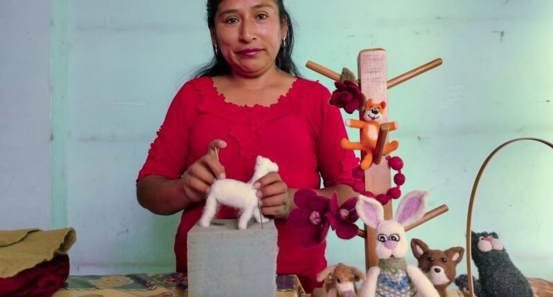 La empresaria utiliza una técnica ancestral para elaborar sus artesanías. Fabrica desde adornos hasta prendas de vestir con fibra de alpaca.